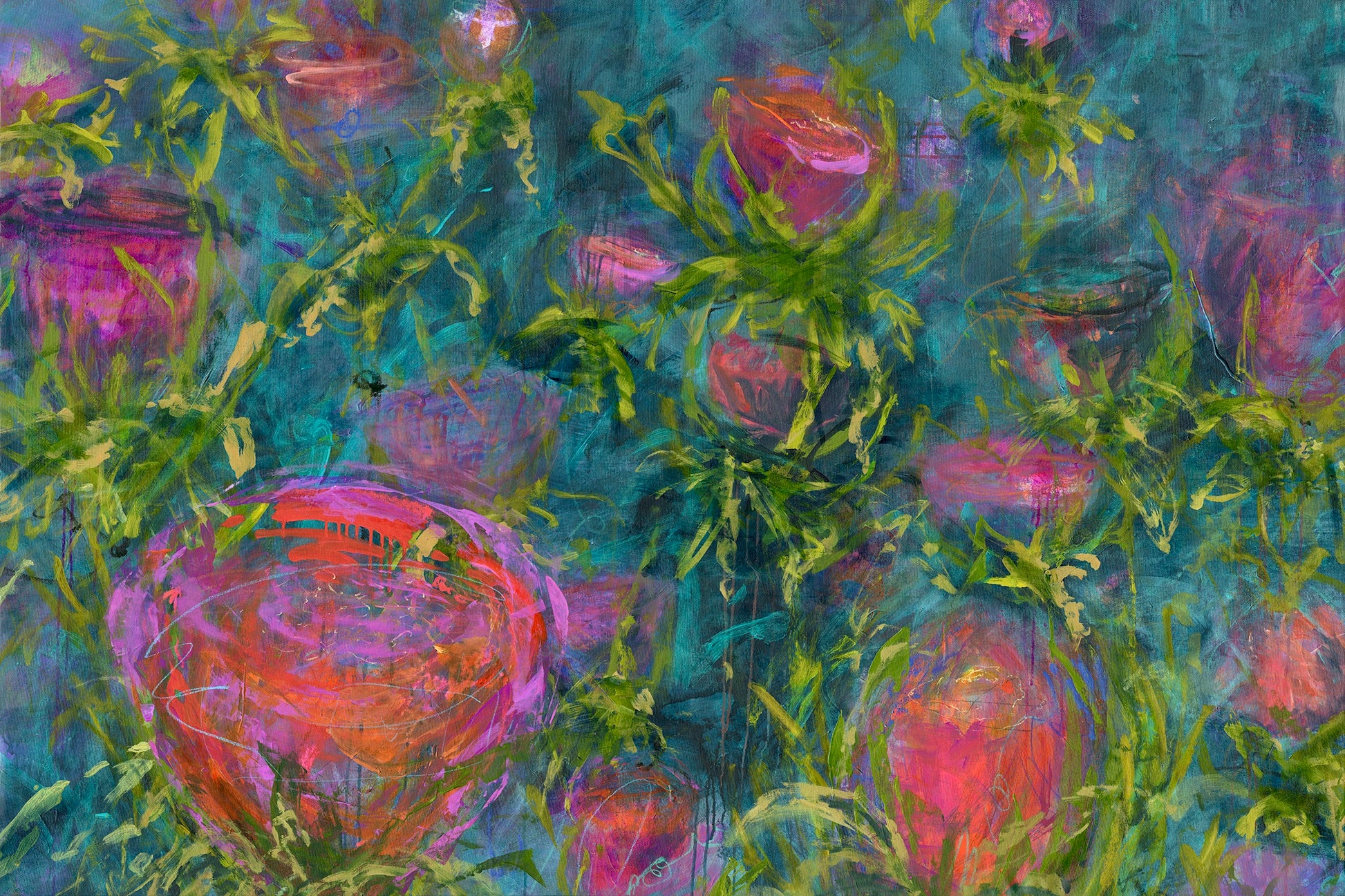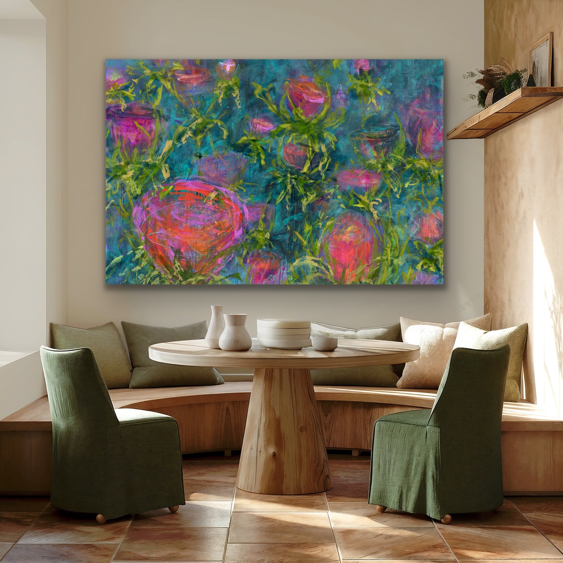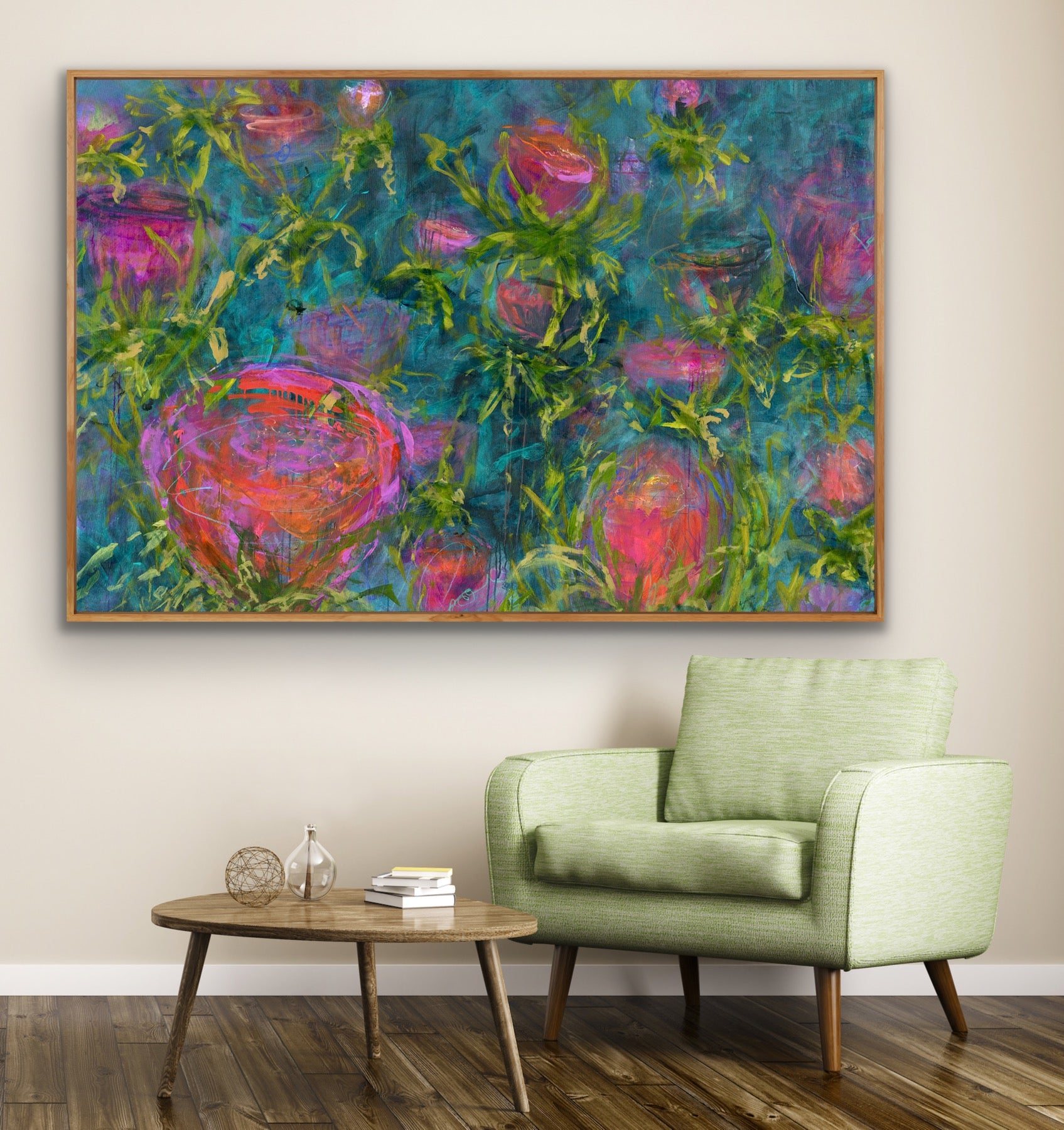 Brighten up your walls (and mood) with Blooms, a large and lively abstract painting featuring vibrant flowers in a contemporary style. Give your space a pop of color and fun with this unique piece.