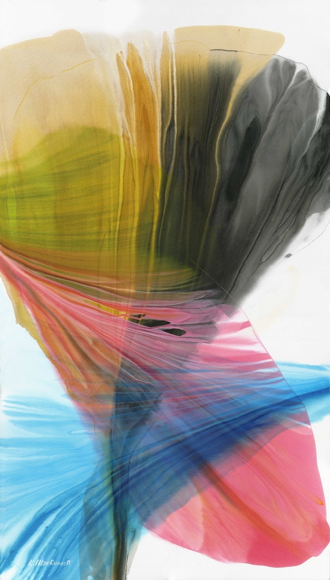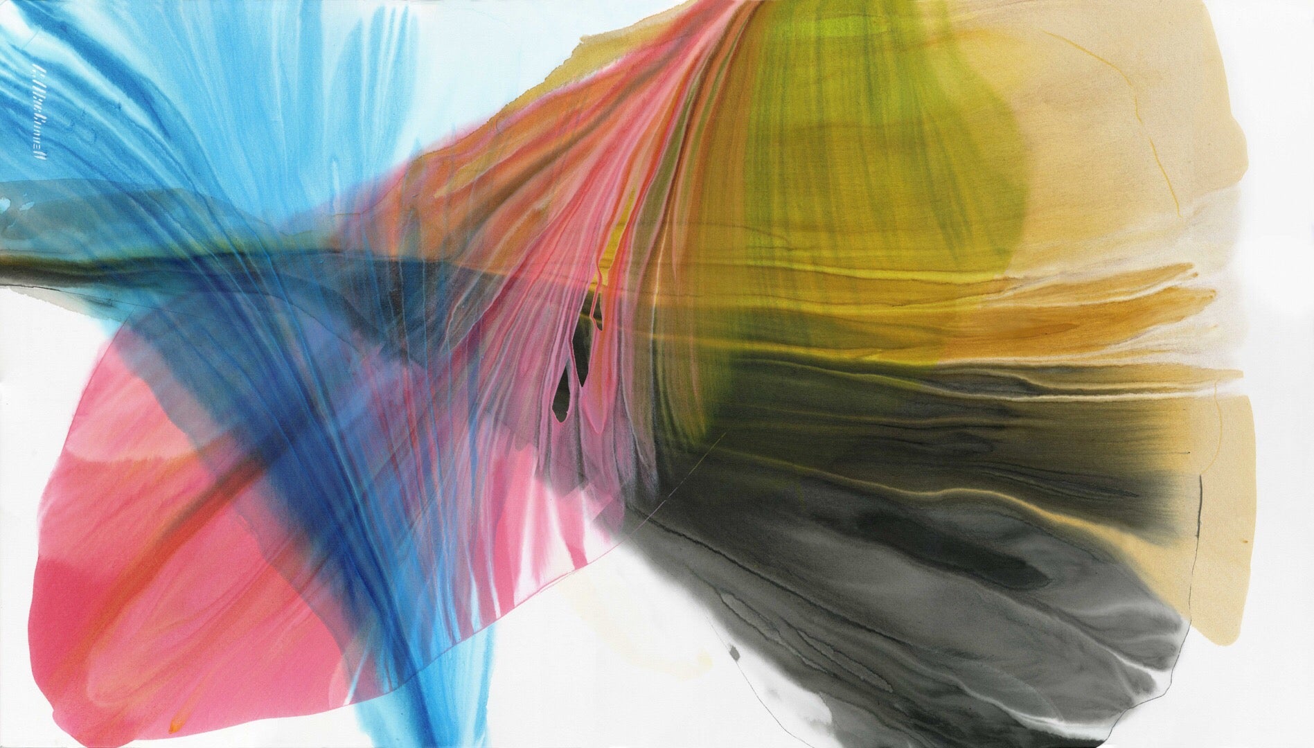 Emerging is a large abstract fluid acrylic. It encompasses translucent, feathery layers of blue, yellow, pink, and black on a white background.