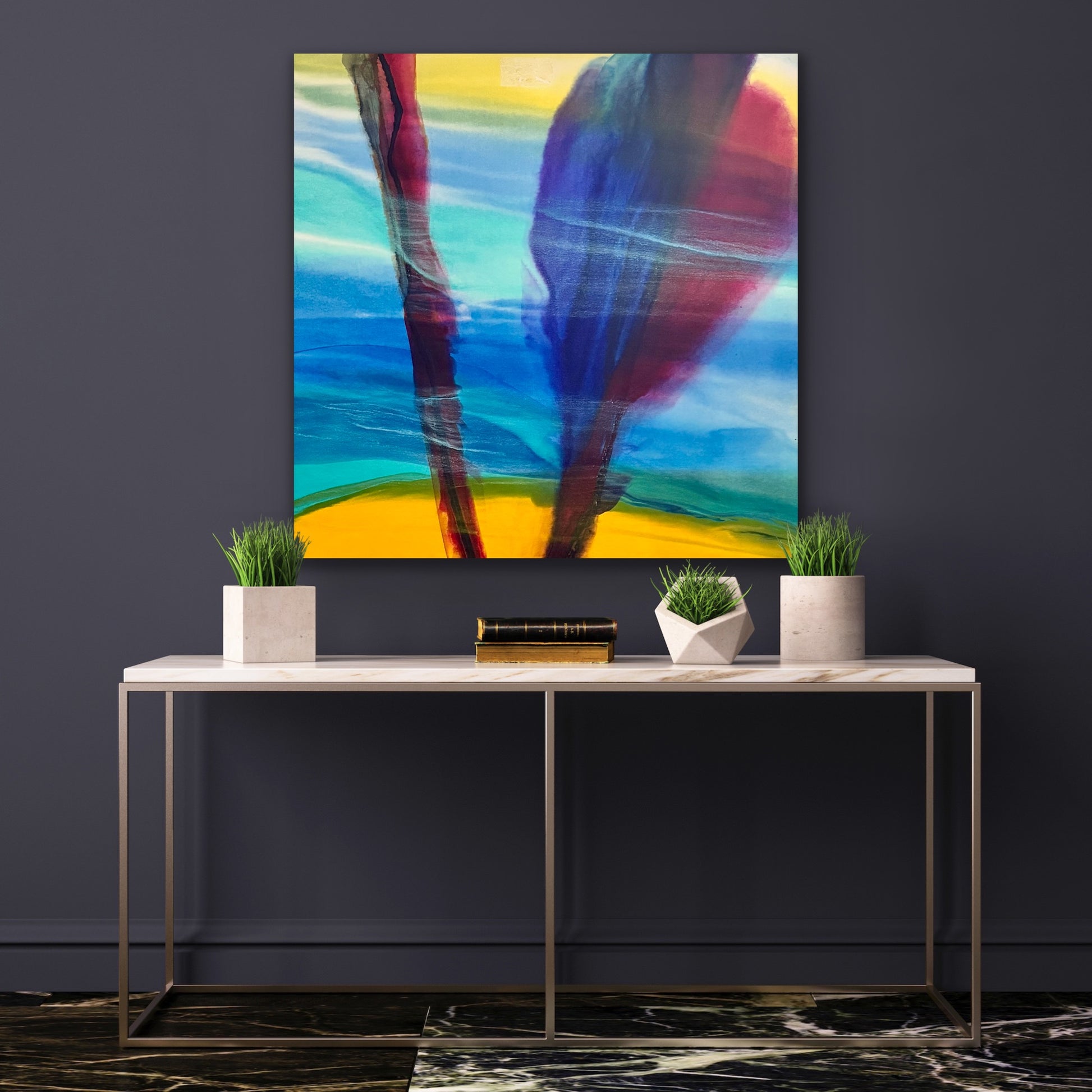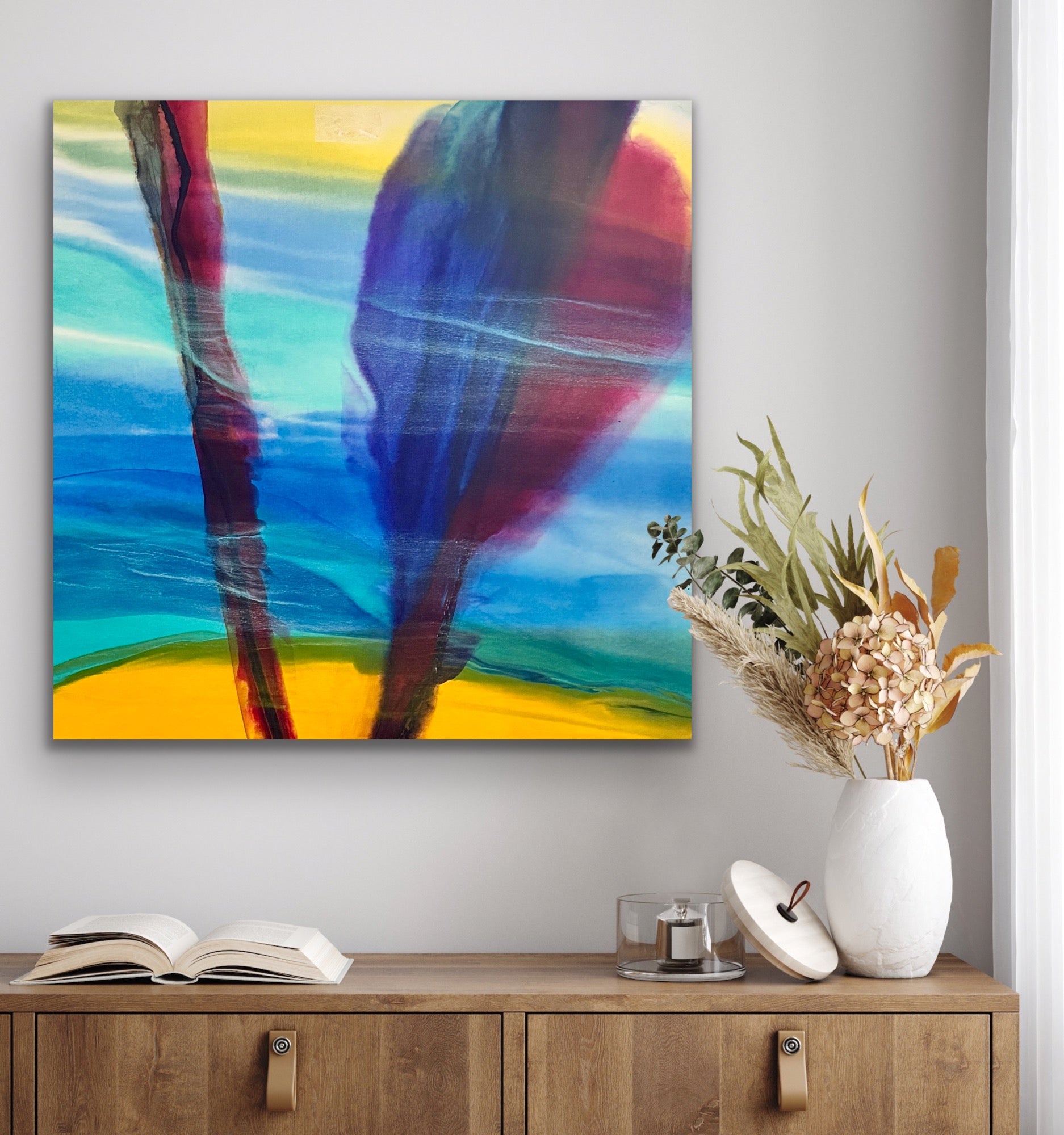 Experience the vibrant energy of Crew I 36x36, an original painting that masterfully blends waves of blue, teal, yellow, and maroon. This dynamic piece evokes the movement and ebb of water, infusing your space with a refreshing yet bold spirit. Its lively colors and flowing forms create a visually engaging focal point that enhances any room with a sense of motion and vitality. Bring the essence of water’s power and beauty into your home with this captivating artwork. Pairs beautifully with Crew II.