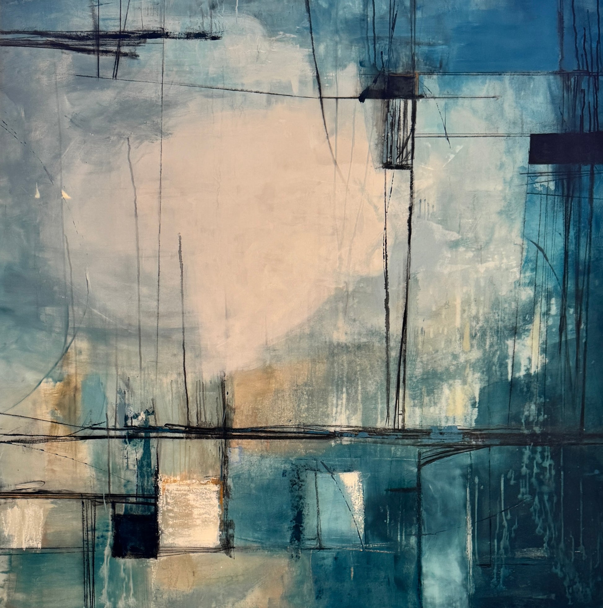 Docks 60x60 captures the raw energy of waterfront labor through bold geometric forms and striking contrasts. Deep blues, crisp whites, and warm creams are sliced by commanding black lines that evoke the industrial architecture of working harbors. This large-scale canvas commands attention with its powerful composition, transporting viewers to a moment of honest, physical work. Perfect for those seeking art that combines contemporary abstraction with authentic grit and character. The painting can be hung in two ways.