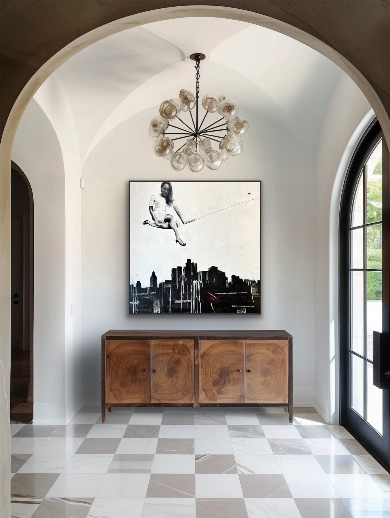 This large-scale black-and-white painting captures a striking image of a woman seated on a tightrope, suspended high above a city skyline. She gazes downward, embodying both strength and vulnerability as she steadies herself in an impossible position. Balance is a visual metaphor for the many roles women navigate—constantly walking the line between work, family, ambition, and expectation. The monochromatic palette emphasizes contrast, echoing the tension between fragility and resilience, stillness and motion, risk and grace.