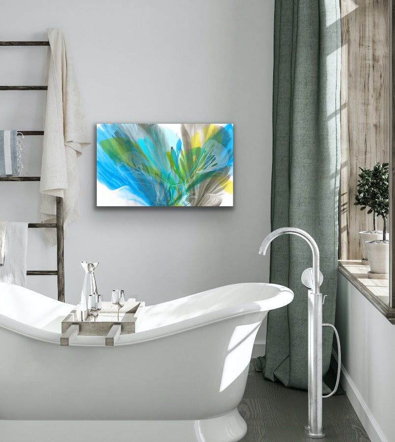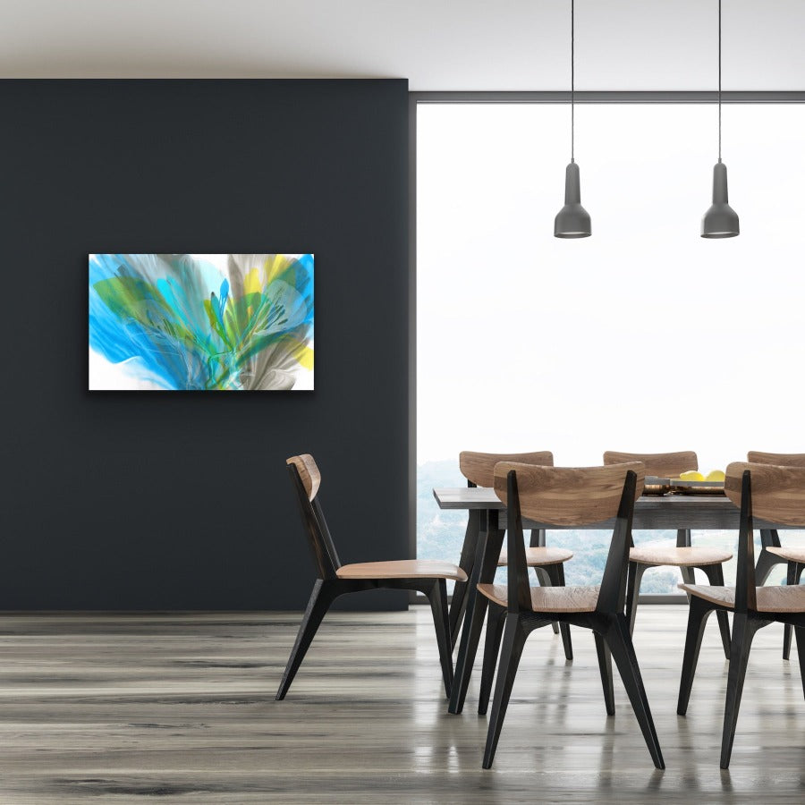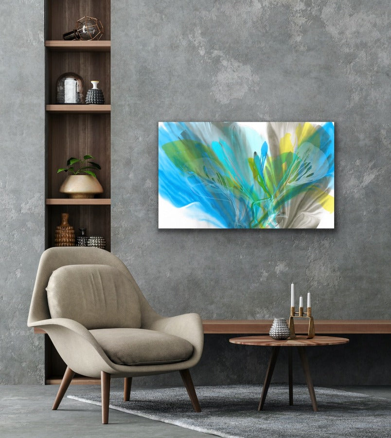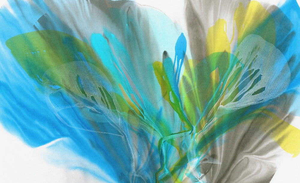 Emerging is a large abstract fluid acrylic. It encompasses translucent, feathery layers of blue, yellow, and grey on a white background.