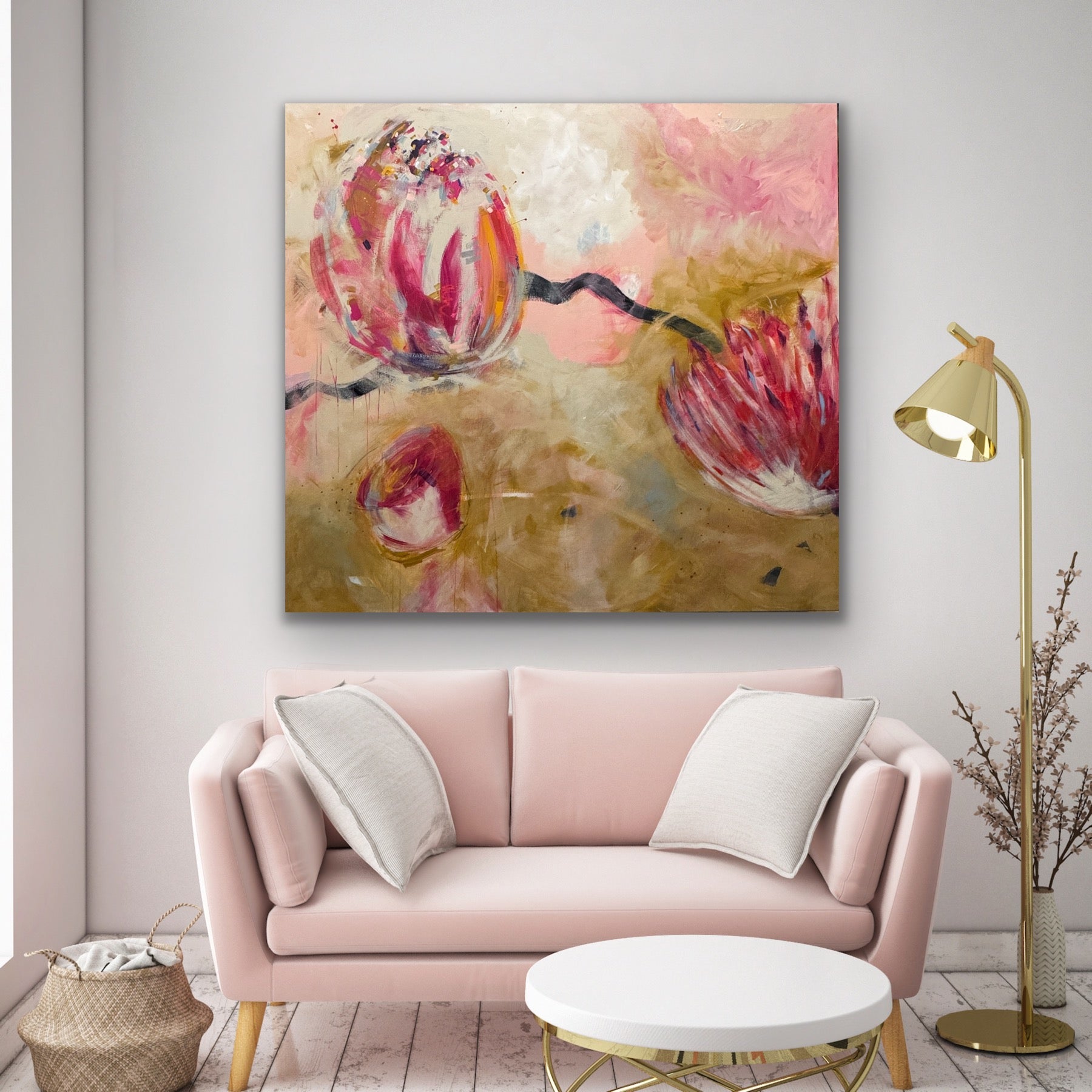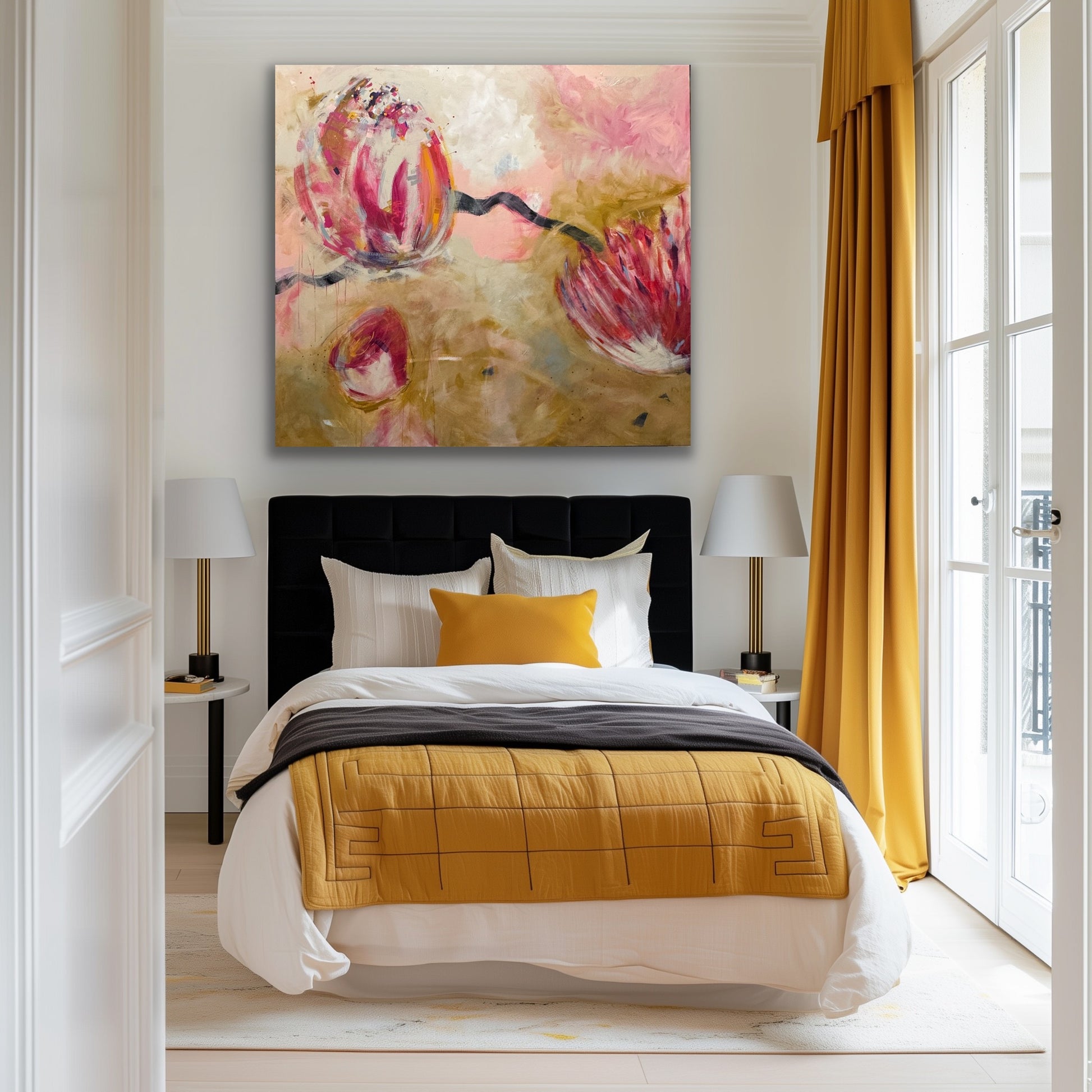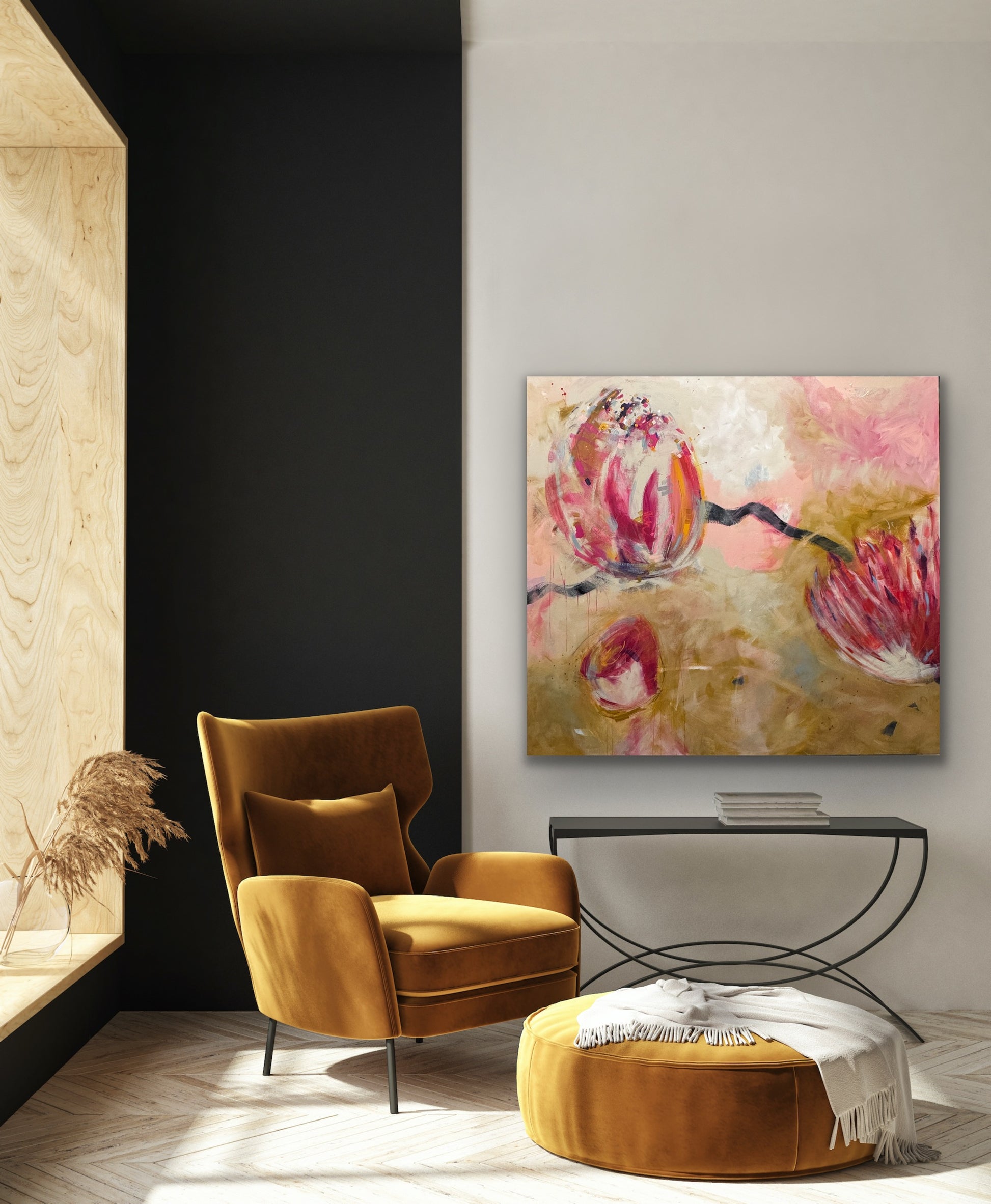 Experience the beauty and energy of "Golden Hour 66x72" - a contemporary painting featuring stunning golden florals in pink, black, and ochre. This large piece was inspired by an abstract on watercolor paper and has taken on a life of its own. Add a modern touch to any space with this unique artwork!