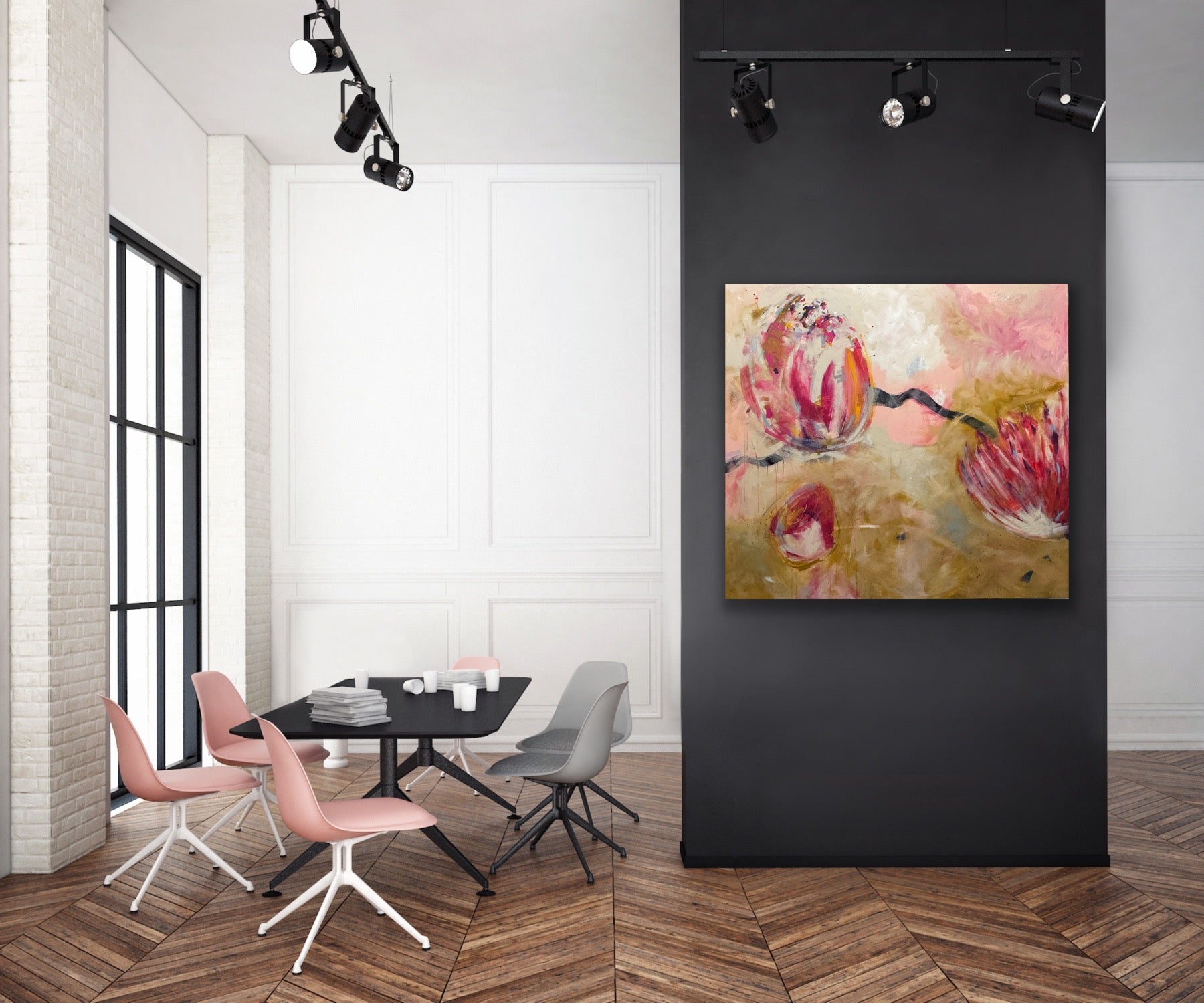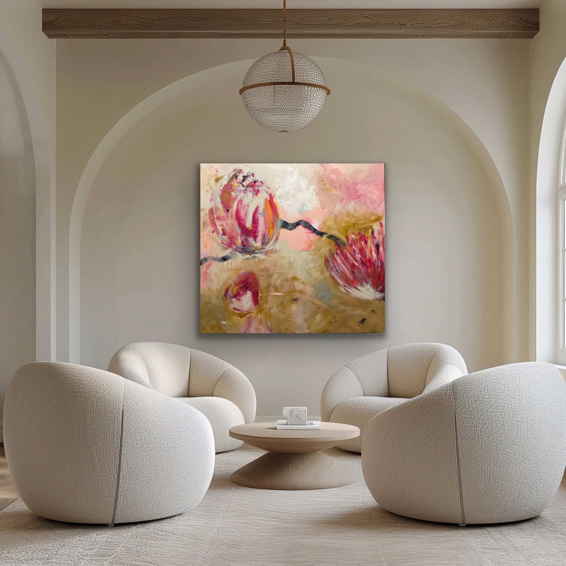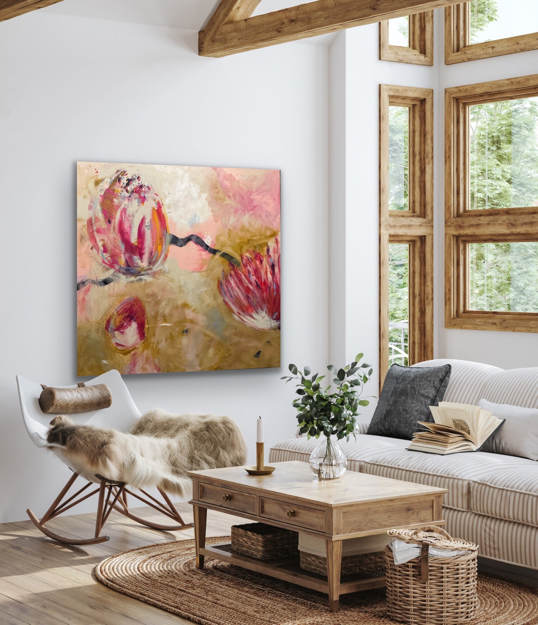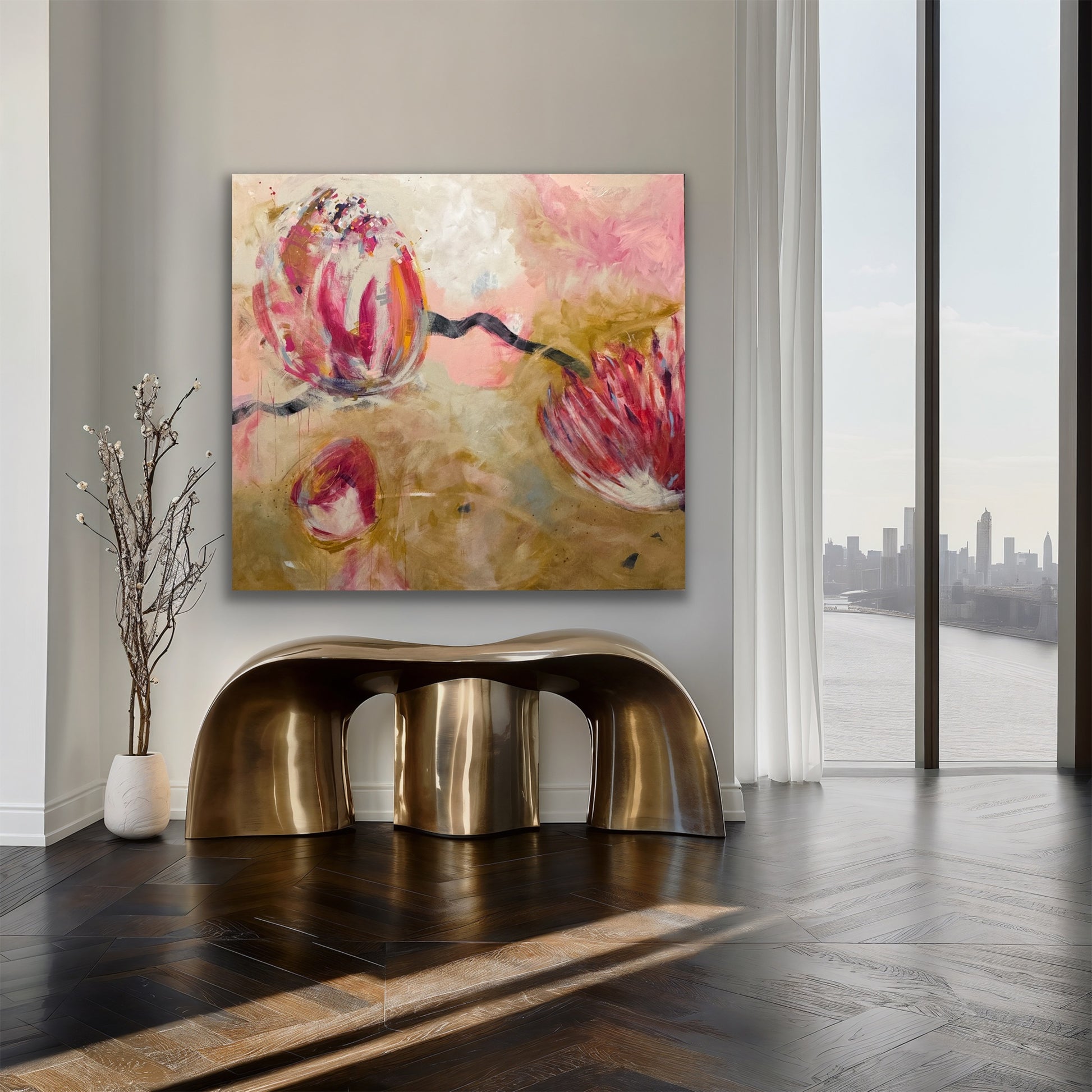 Experience the beauty and energy of "Golden Hour 66x72" - a contemporary painting featuring stunning golden florals in pink, black, and ochre. This large piece was inspired by an abstract on watercolor paper and has taken on a life of its own. Add a modern touch to any space with this unique artwork!