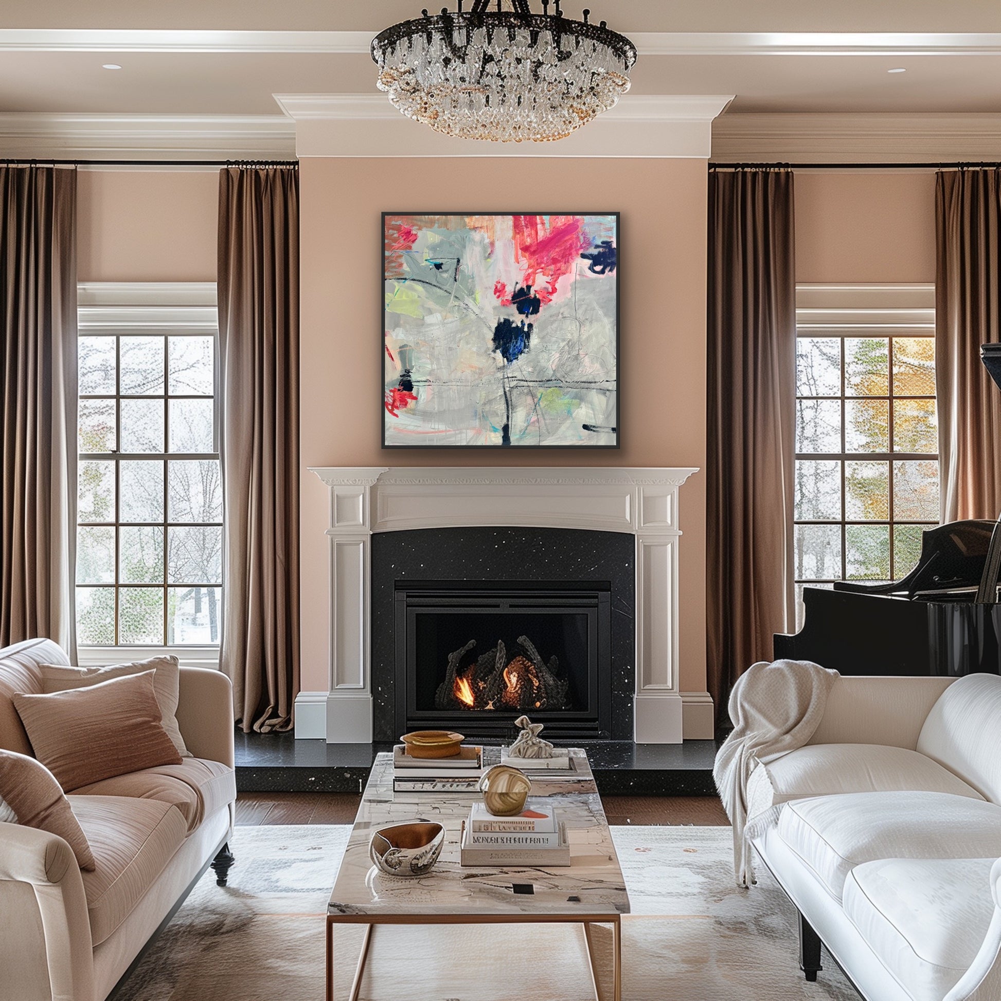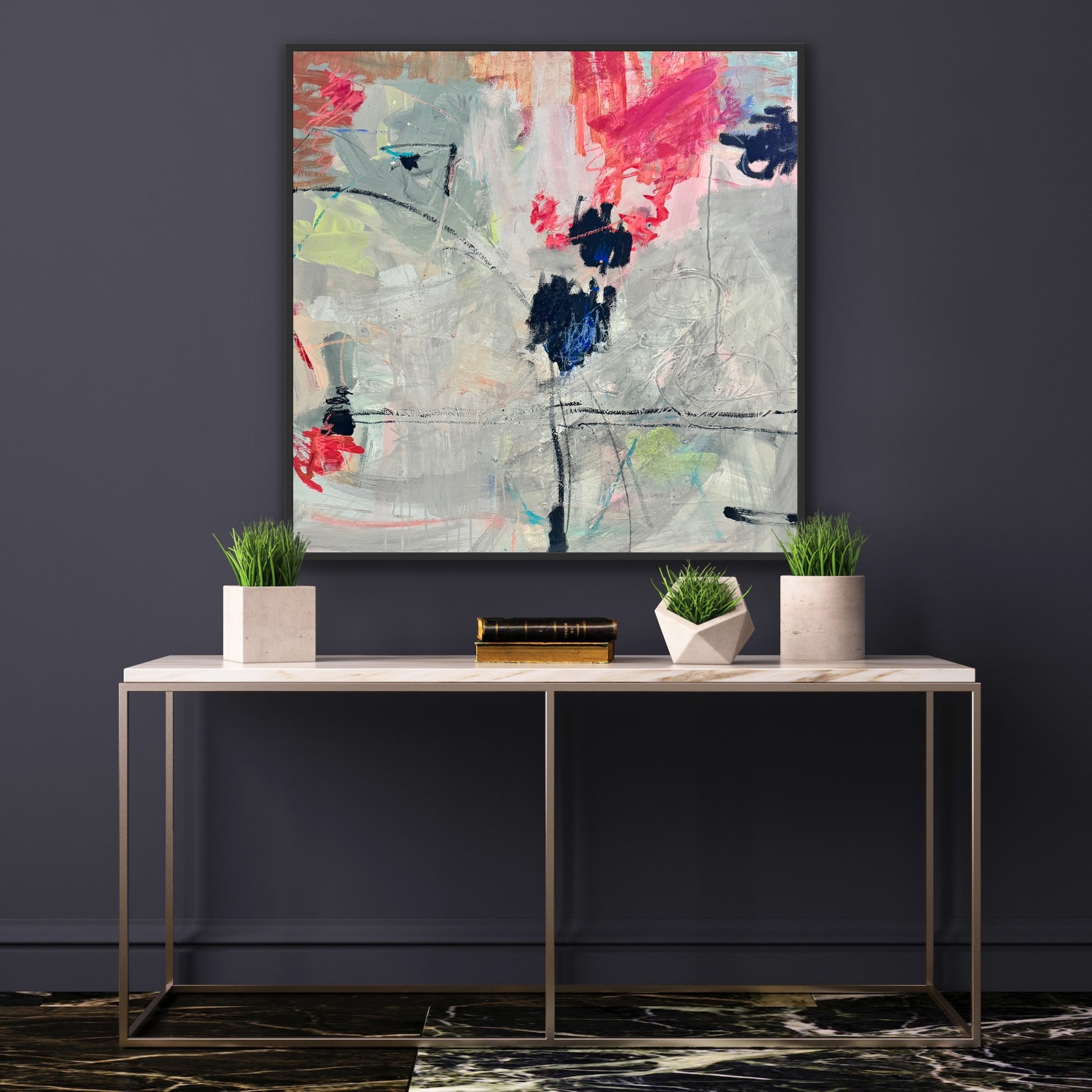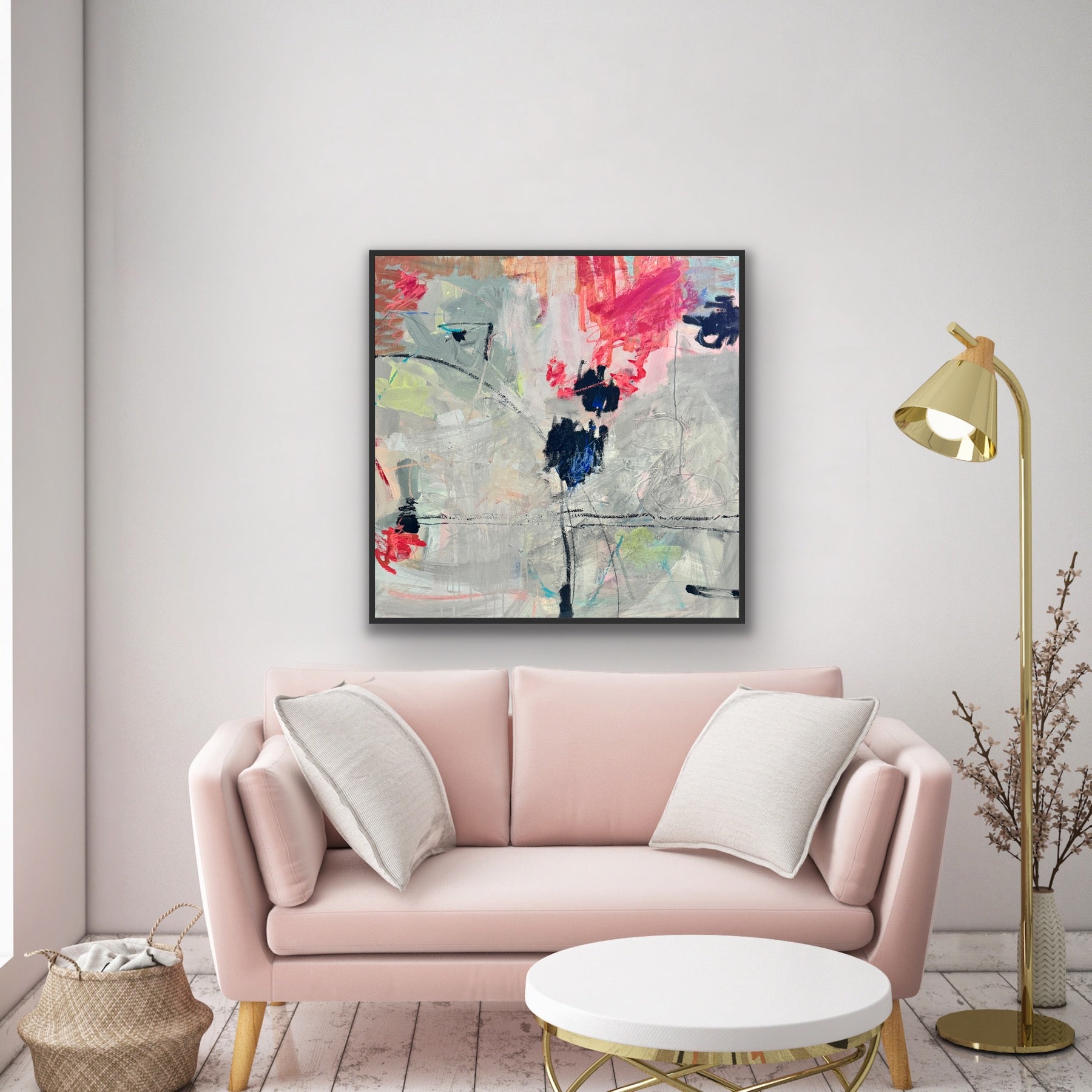 Experience the compelling tension of this 36x36 contemporary abstract work. Layered textures in soft grey and vibrant pink create visual intrigue, anchored by bold black elements that ground the composition. The interplay between contrasting elements produces a sophisticated harmony that rewards close examination. Rich surface details invite tactile appreciation, while the balanced color palette brings elegance and depth to your space. A thought-provoking piece for discerning collectors who value complexity and refined artistic expression.