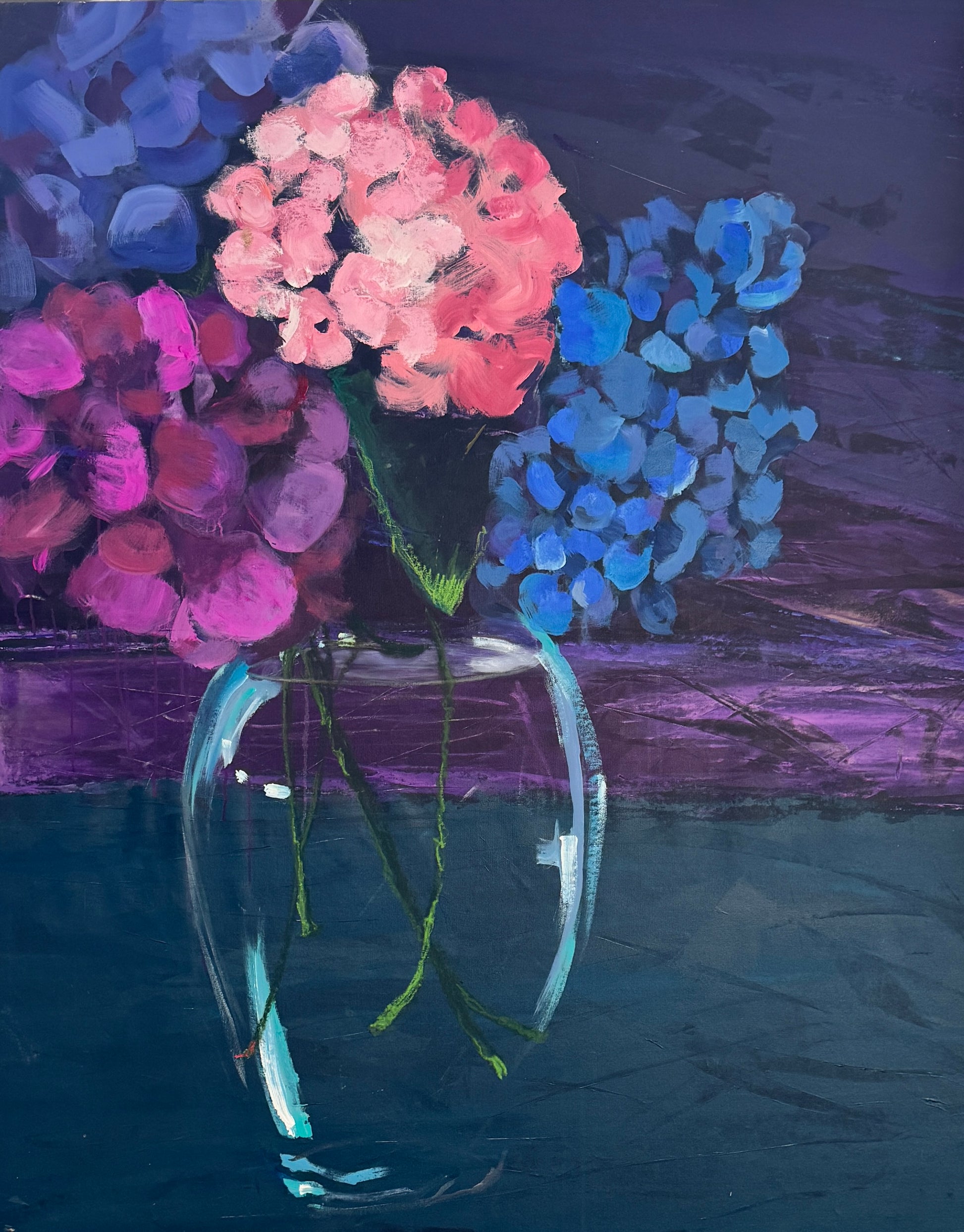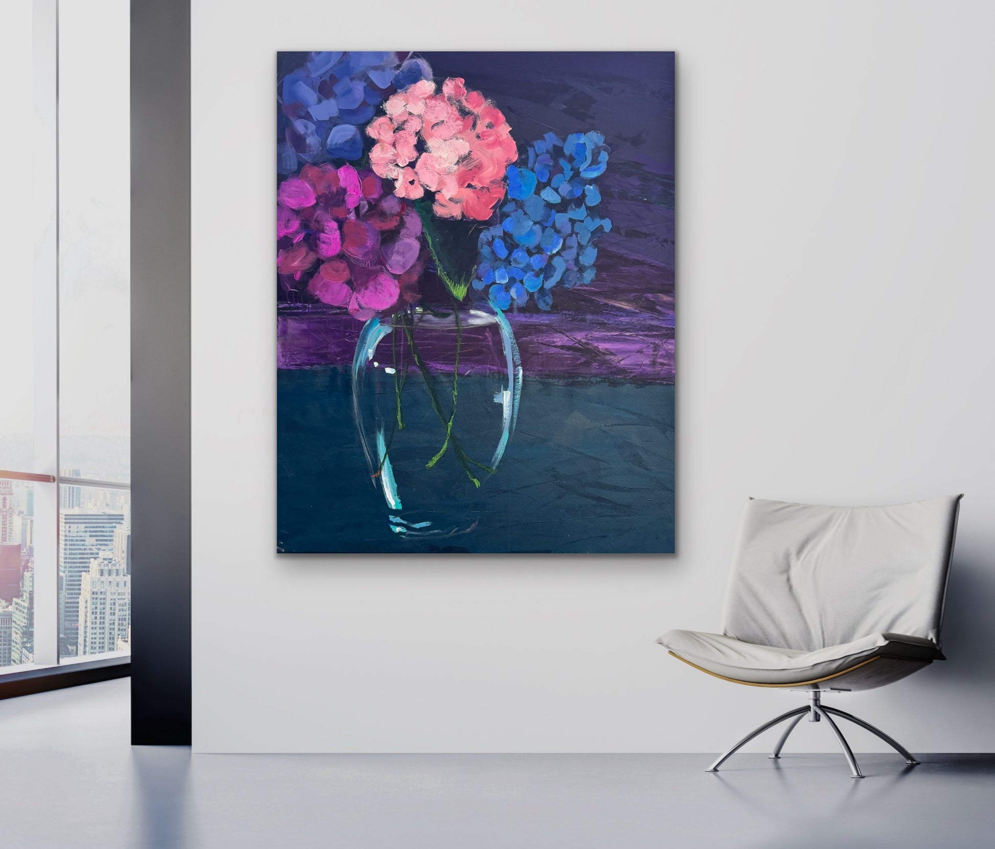 Experience the breathtaking allure of hydrangeas rendered in expansive scale. This dramatic painting celebrates the flower's most captivating hues—blushing pinks, velvety purples, and tranquil blues—layered with artistic intensity. The generous canvas size makes an undeniable statement, transforming walls into galleries of botanical splendor. Ideal for discerning collectors who seek artwork that combines natural elegance with bold visual presence, this piece commands admiration and sparks conversation in any interior.