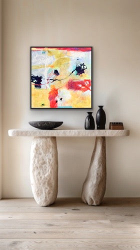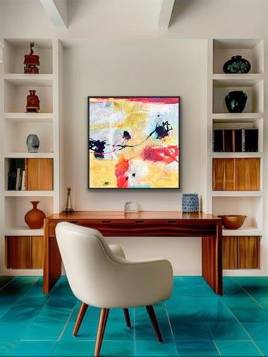 Discover the captivating allure of this 36x36 contemporary abstract painting. Warm yellows and reds intertwine with cool blues and dramatic black lines, creating a composition that feels both playful and mysterious. The energetic brushwork invites viewers to uncover their own interpretations, making each glance a new adventure. This striking piece brings warmth, movement, and personality to any room, perfect for art lovers who appreciate bold color and dynamic visual storytelling.